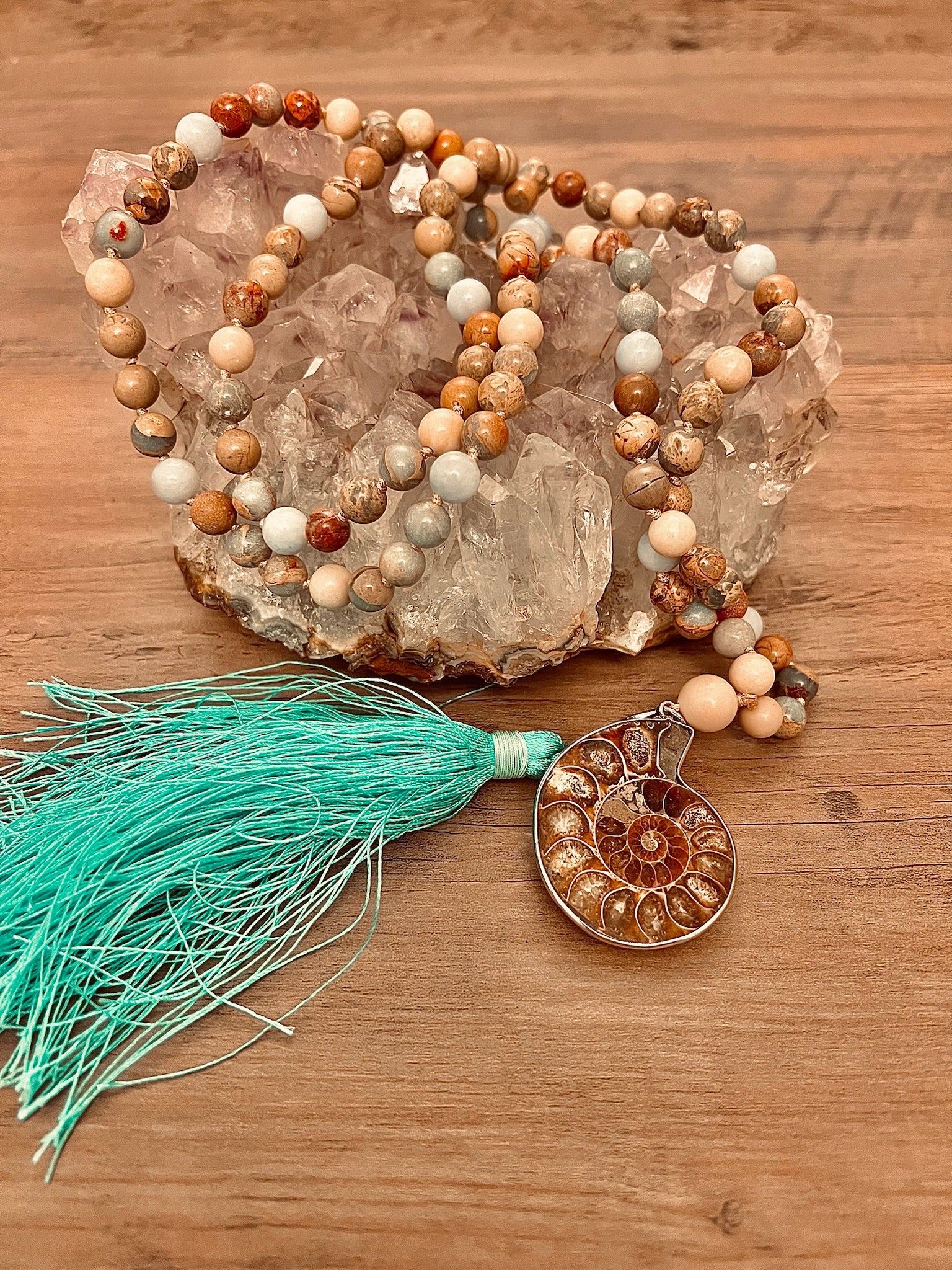 Whether you're seeking emotional balance, courage to speak your truth, or connection to ancient wisdom, this amazonite and ammonite mala becomes a powerful companion—calming you, grounding you, and supporting your transformation.