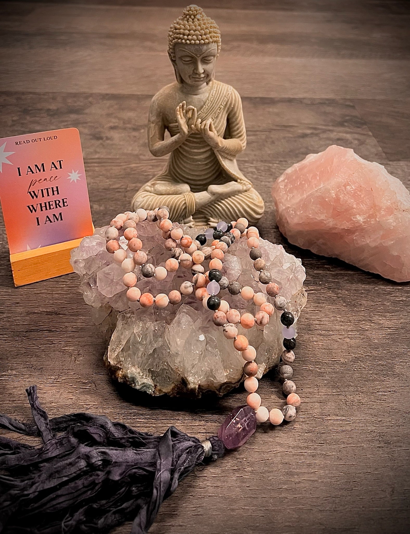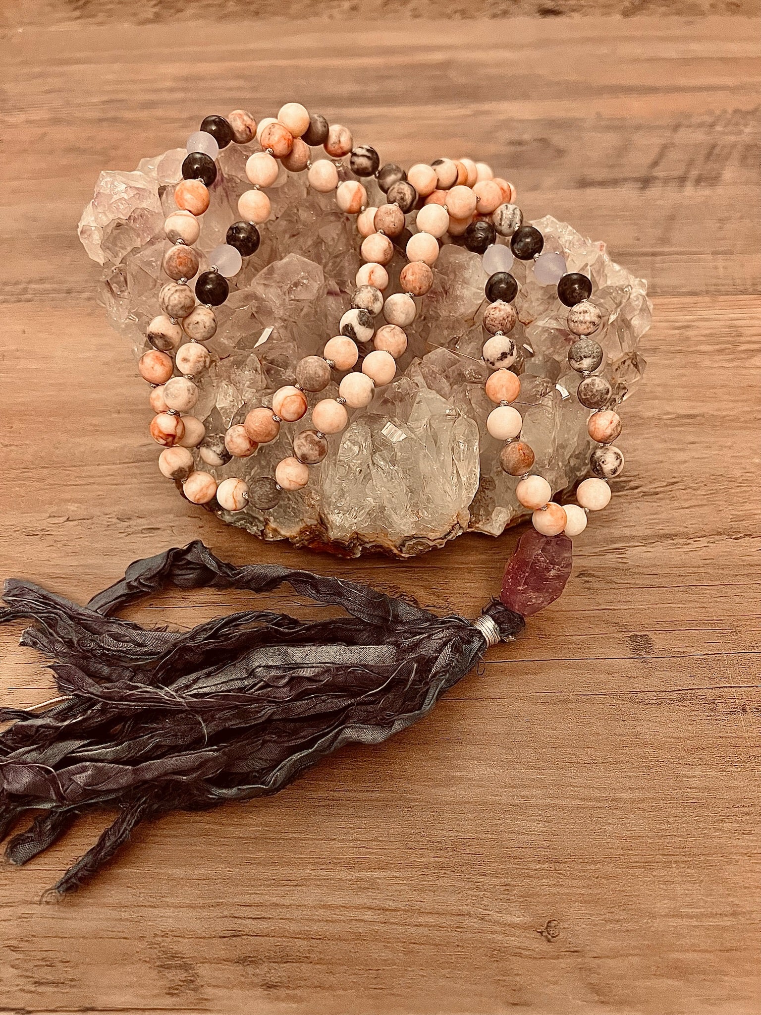 Transform your meditation practice with this handcrafted mala featuring the nurturing energy of pink zebra jasper and the calming wisdom of amethyst.
