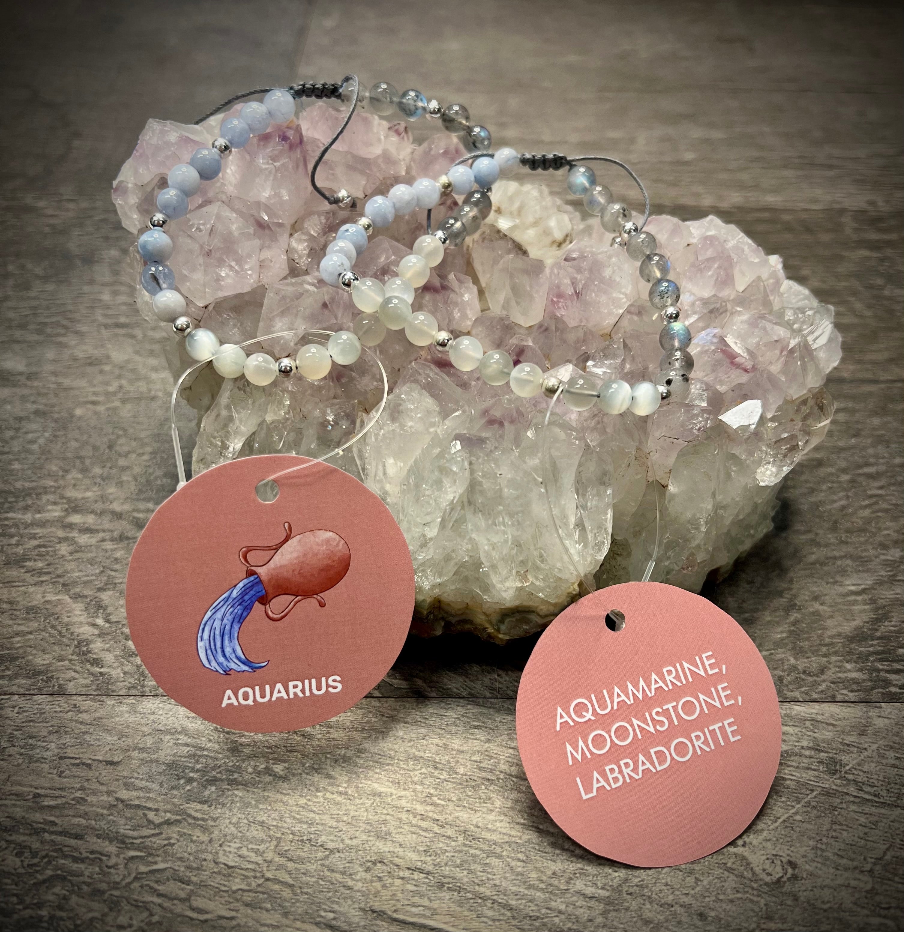 Aquarius is the progressive air sign known for innovation, independence, humanitarian ideals, and visionary thinking. This bracelet's gemstone combination supports Aquarius' greatest strengths—clear communication, intuitive wisdom, and transformative magic—while encouraging authentic expression and revolutionary change.